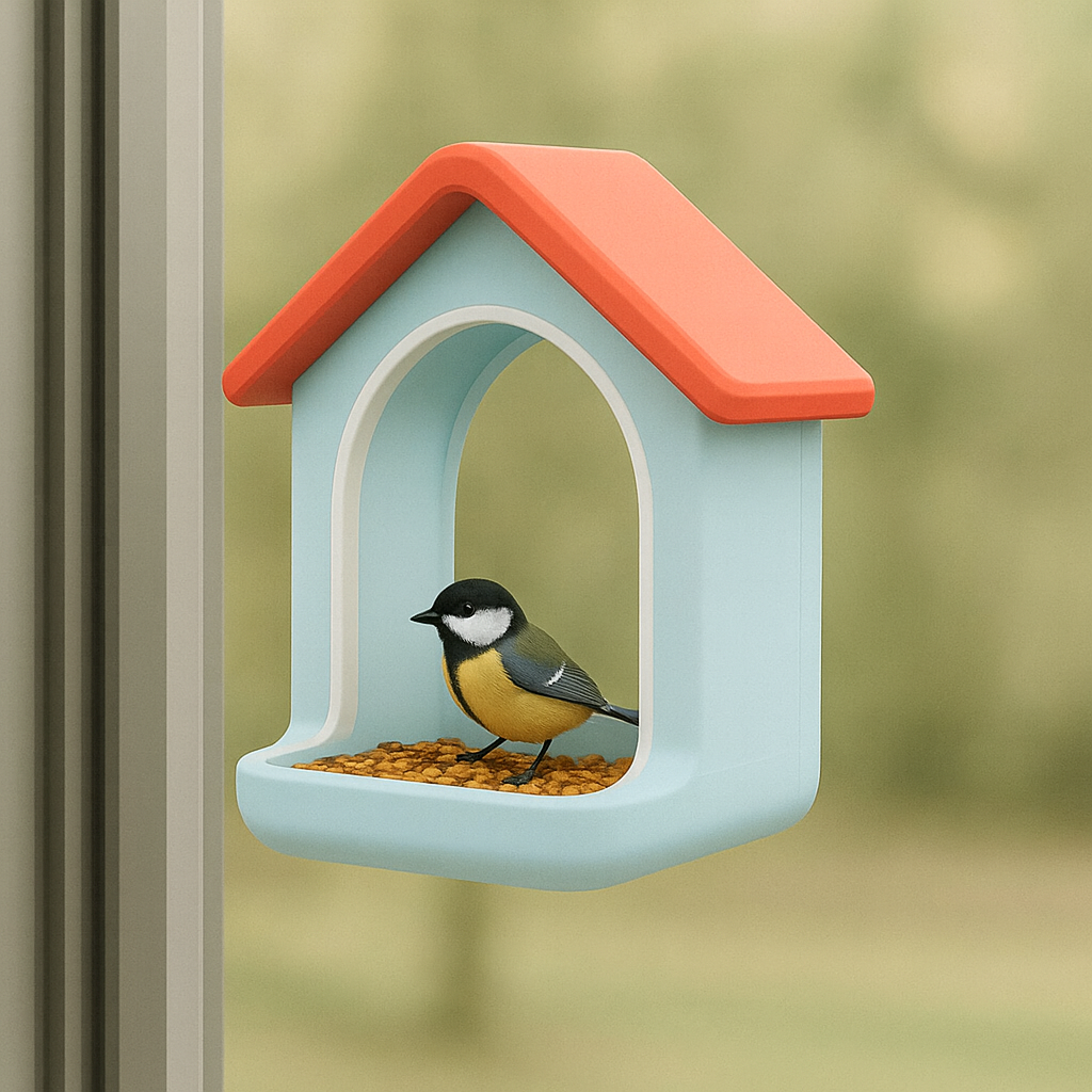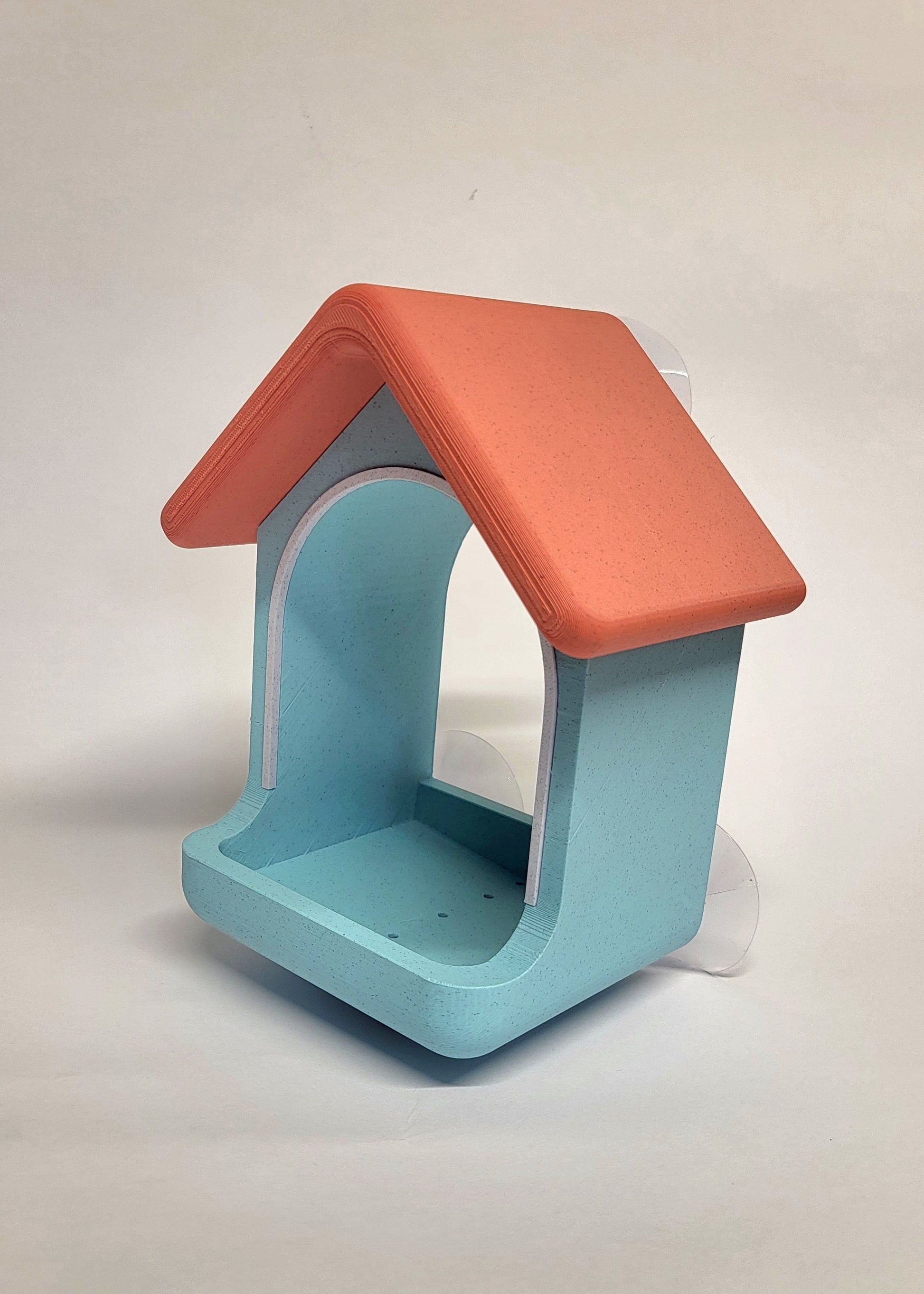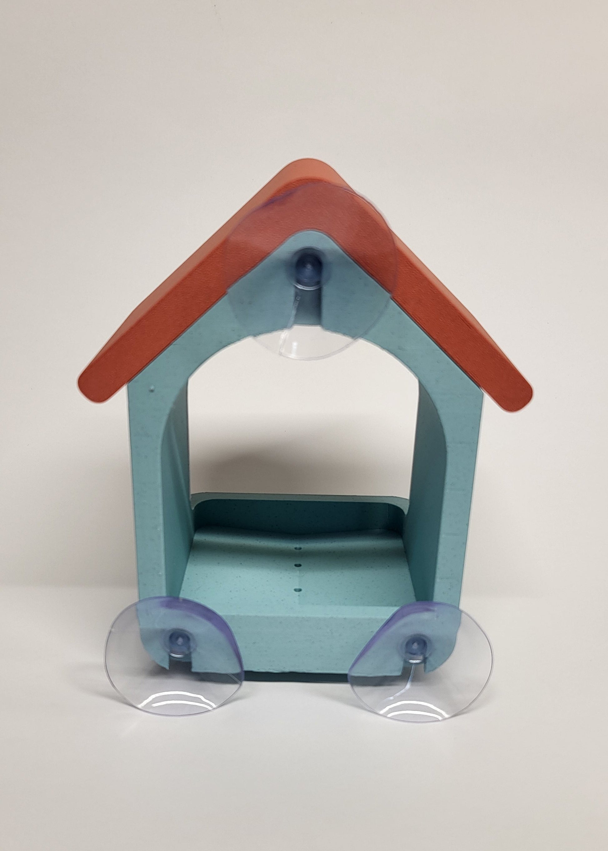 Izdelana je z mislijo na naravo in trajnost, iz okolju prijaznega 3D-tiskanega materiala (PLA). odprti zadnji del omogoča jasen pogled na ptičke, medtem ko strešica ščiti hrano pred dežjem.